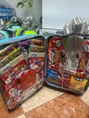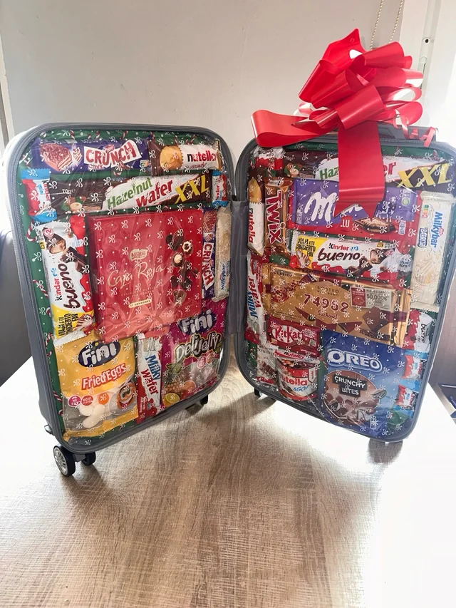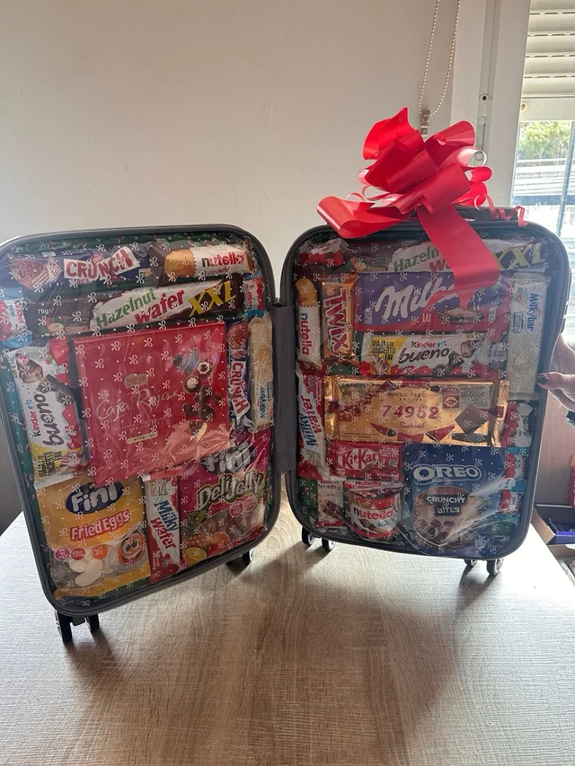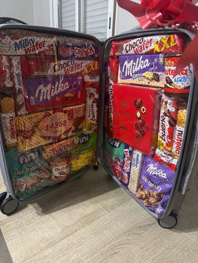 Reisende reisende, mit verschiedenen formen Von schokolade und süßigkeiten. Darunter die marken Crunch, Fini, Kinder, Milka, Nutella und Twix. Eine reiche palette Von schokoriegeln, schokolade und bonbons. Es ist eine mischung aus beidem.